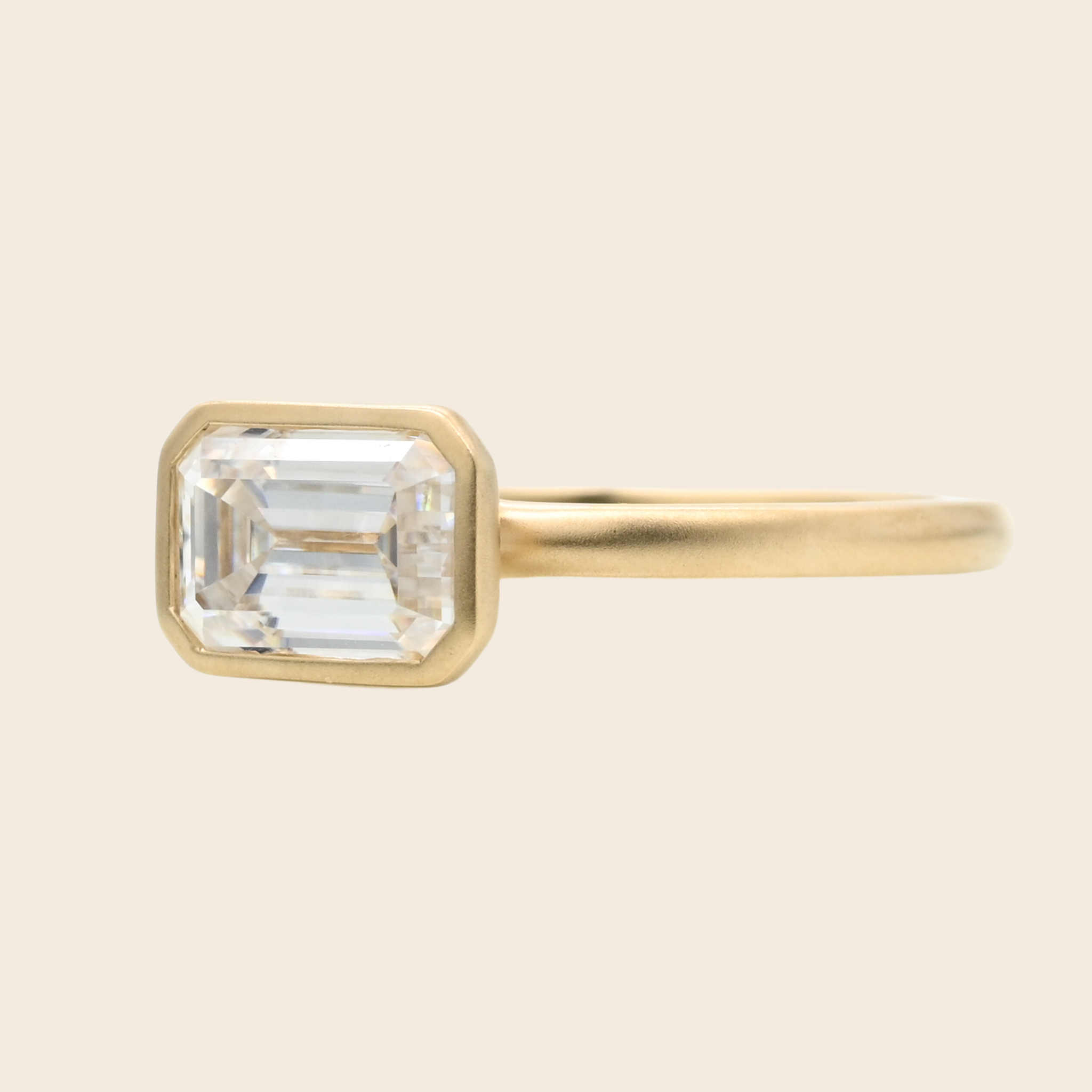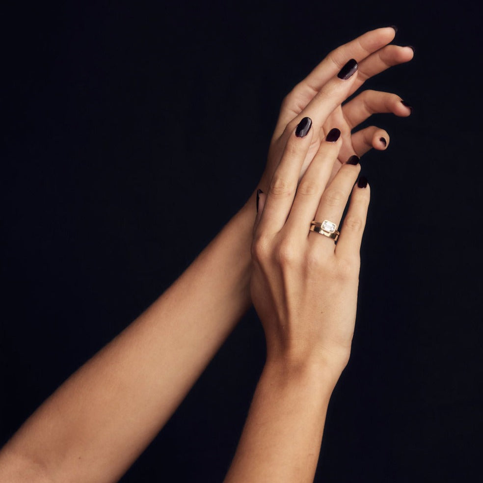 The Agnes provides a fresh take on a bezel setting. A luxe satin matte finish compliments the crisp lines of the Agnes ring.