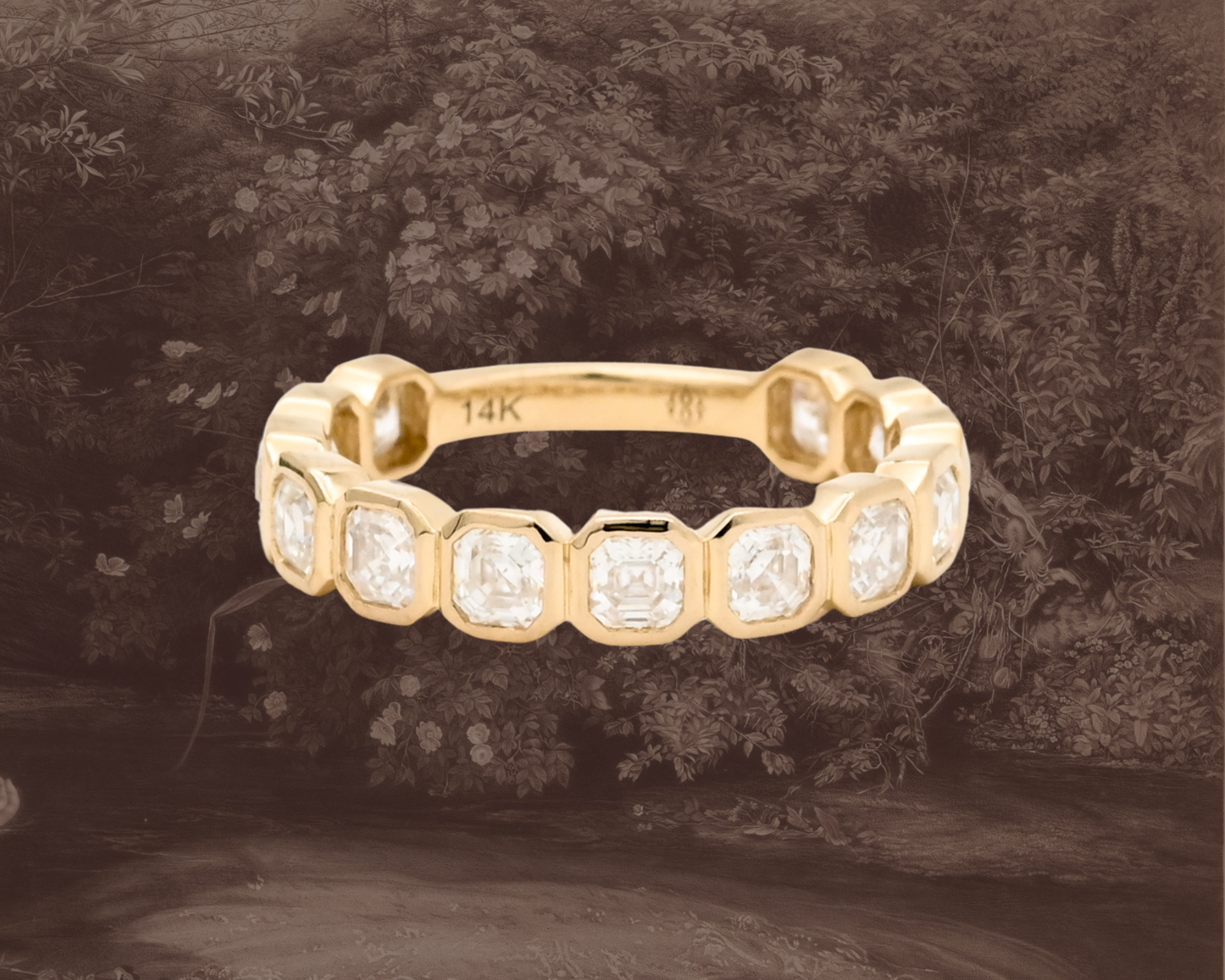 Meet our Asscher cut bezel set eternity band, a petite take on our larger Atlas Band.