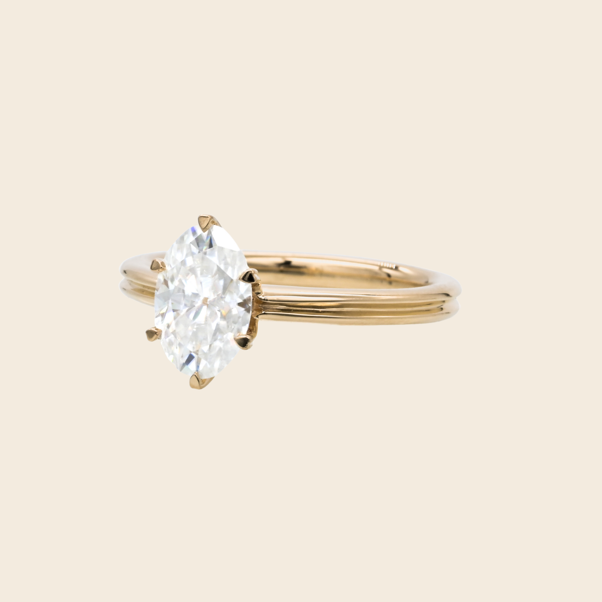 Meet our signature oval moissanite engagement ring, featuring a six-prong antique crown setting.